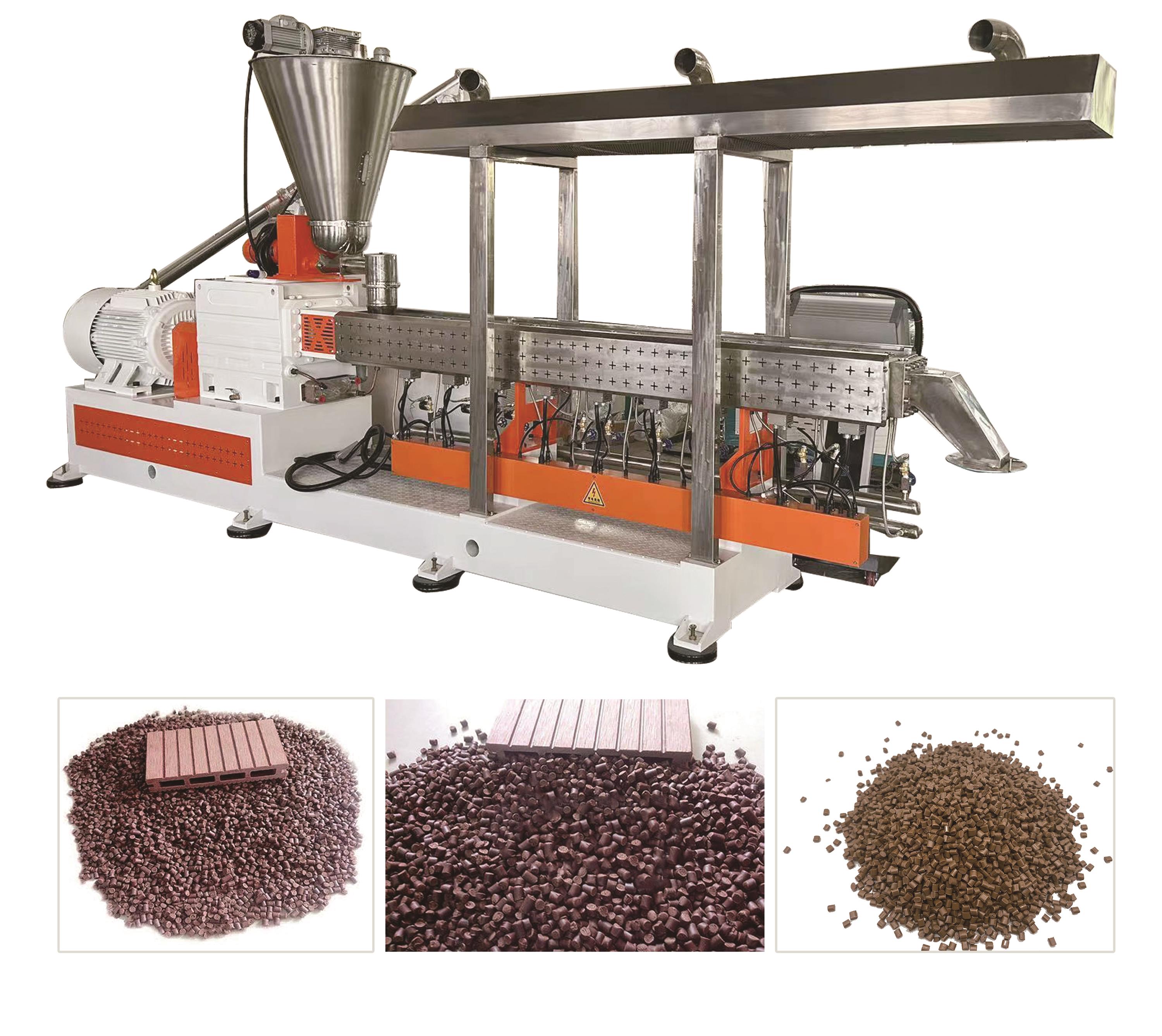 該生產線可連續穩定生產PPPE木塑顆粒,其設備優點為高剪切、高塑化,可使塑料與木粉以及助劑充